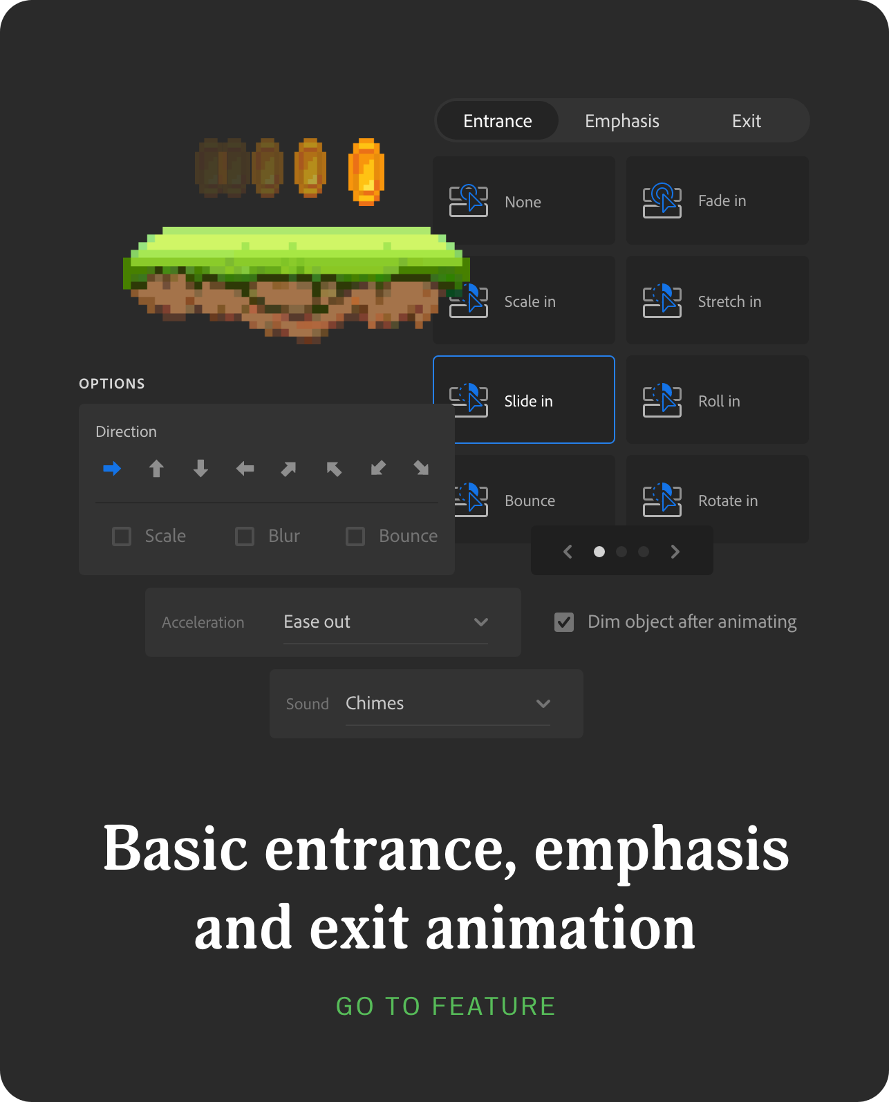 Using the timing distribution controls, authors can stagger the appearance and disappearance of the objects to perform a choreography of the whole page with a single click.