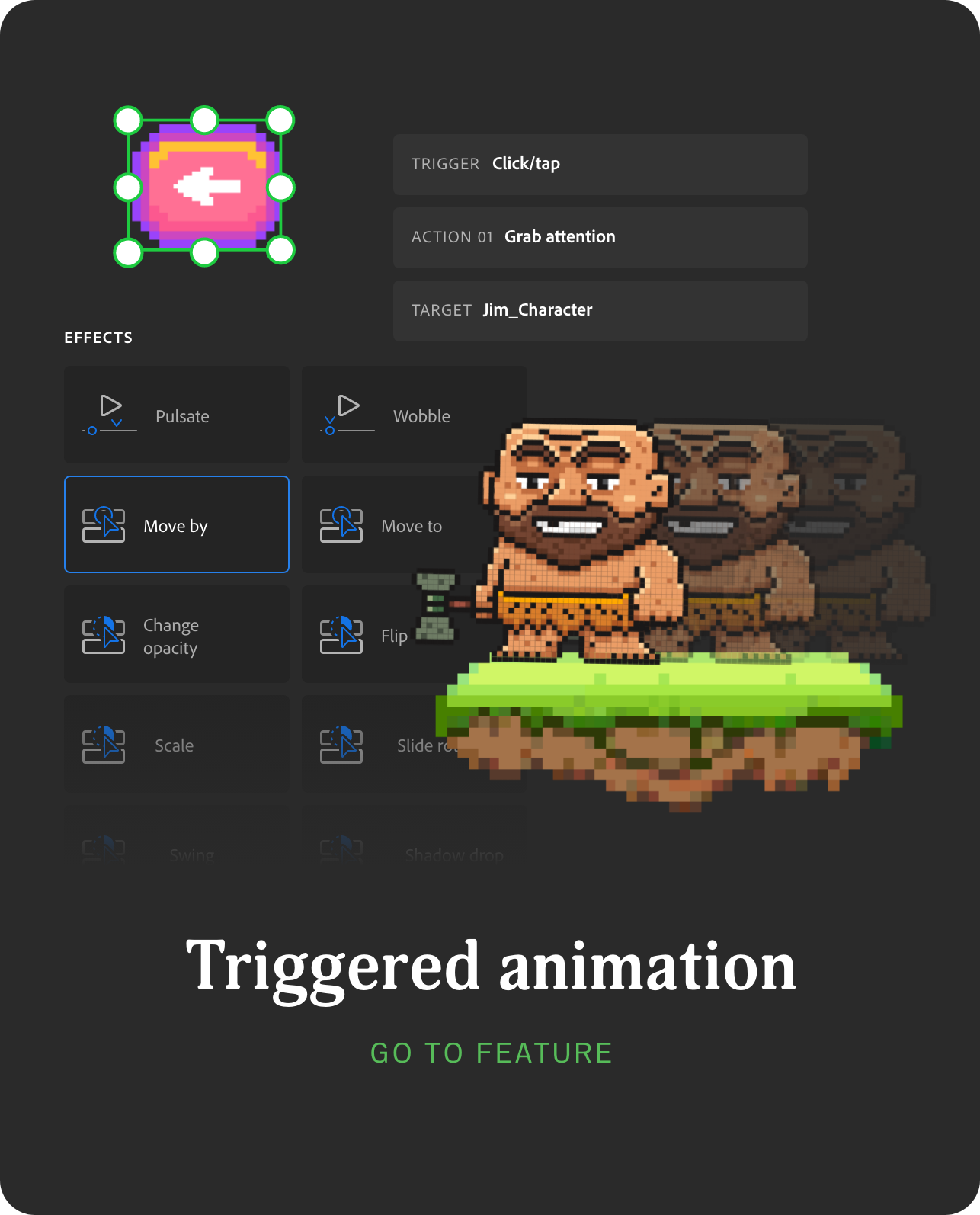 Animation triggered by the learner’s interaction with objects is not present on the timeline, since its timing cannot be determined until the run-time. Authors can configure these as the “grab attention” action, which gives some kind of feedback (visual or otherwise) to the learner’s interaction (like wobble on wrong answer, move on correct answer, etc.).